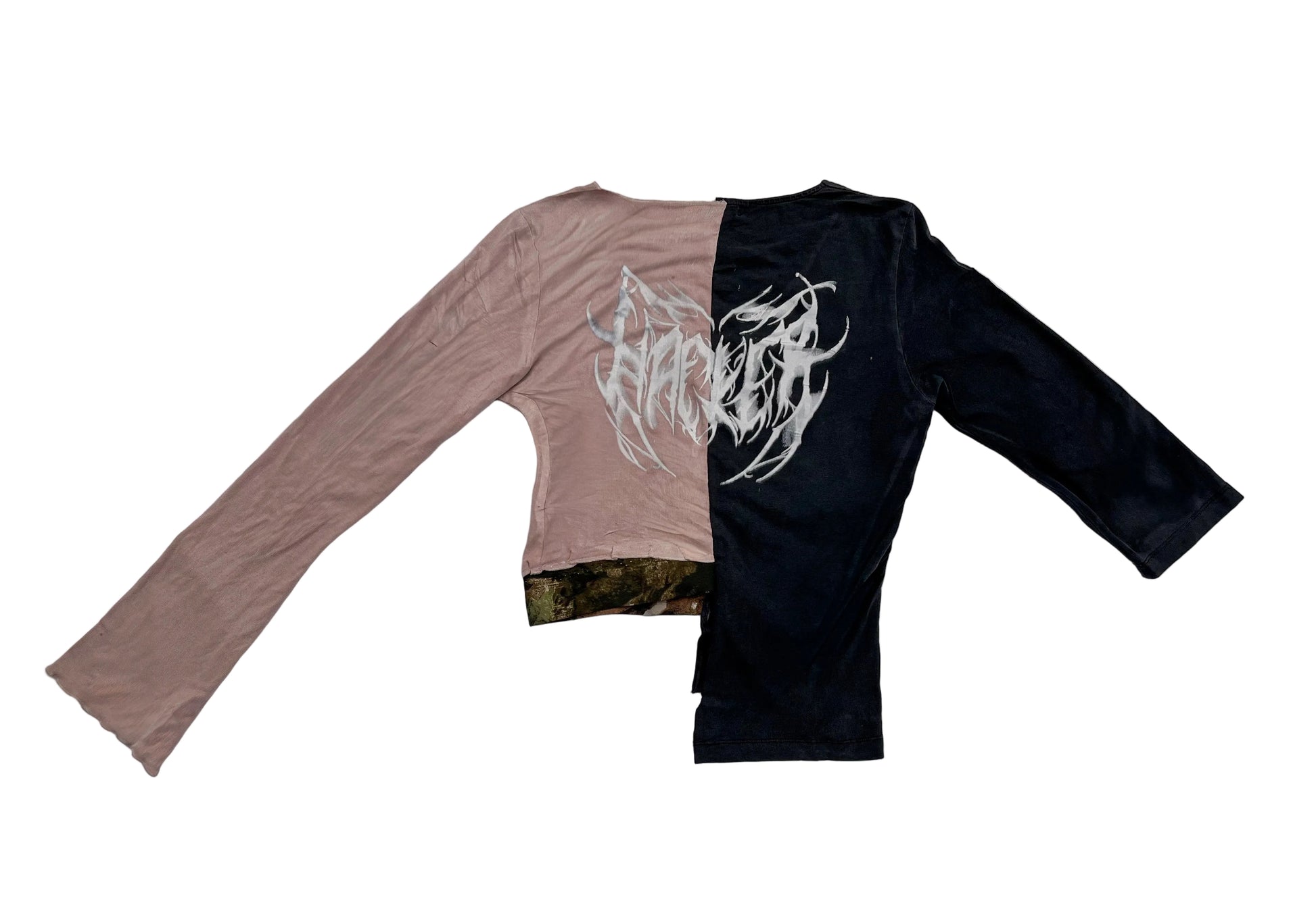 Top de manga larga con diseño bicolor: mitad negro intenso, mitad mocha suave. Pieza única da vibras grunge sin dejar de ser linda.