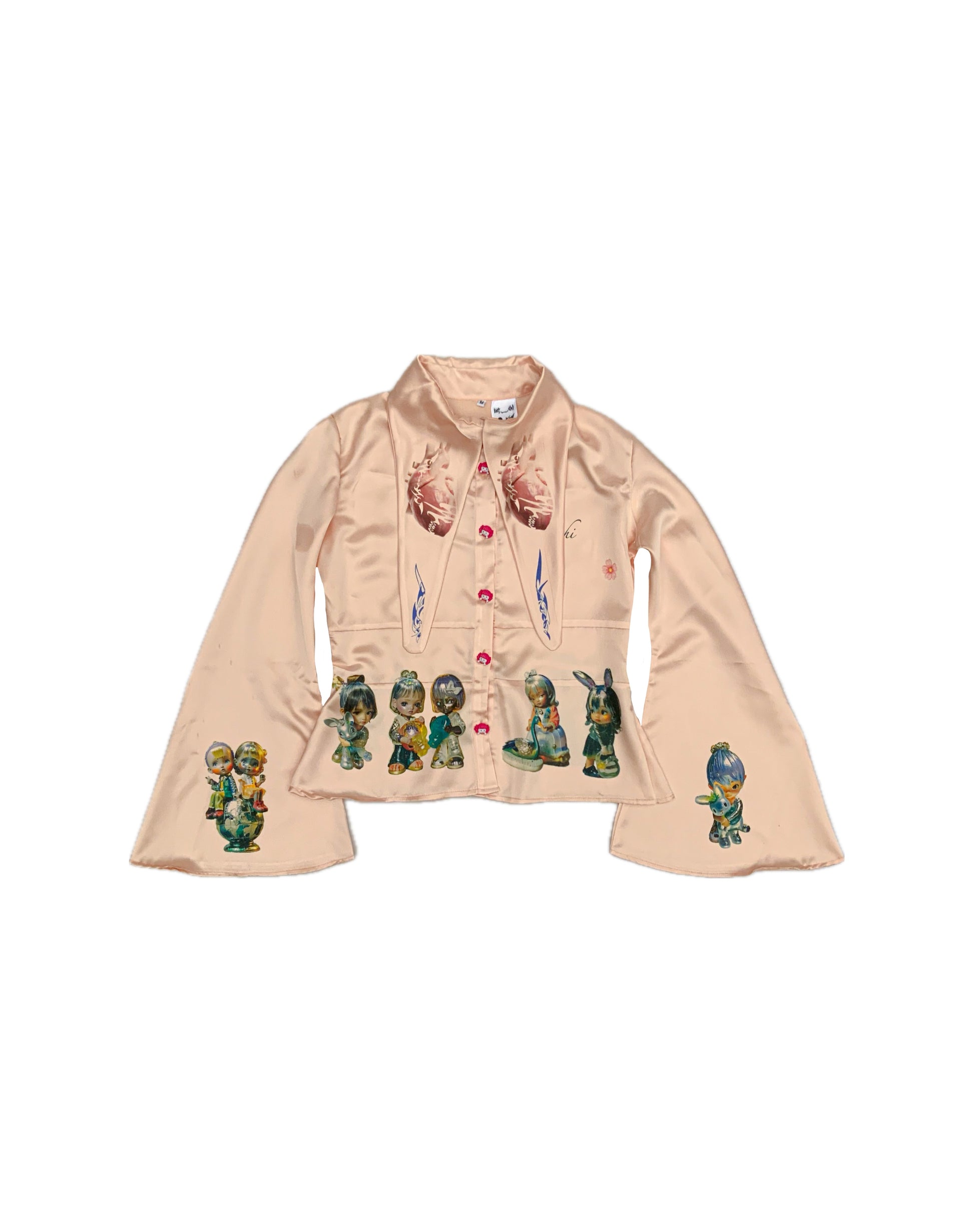 Camisa color durazno entallada con estampado de muñecas en mangas, pecho y espalda, de mangas acampanadas y cuello alto, luce sofisticada y única. 🖤✨🦢