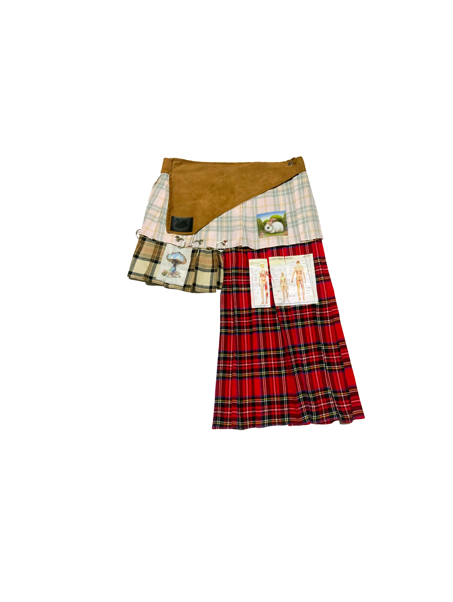 Falda asimétrica de tartán, inspirada en escuelas mexicanas.