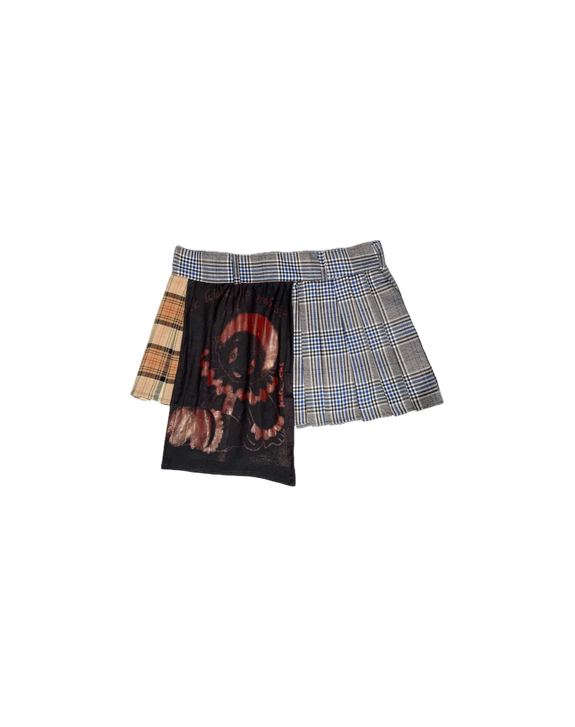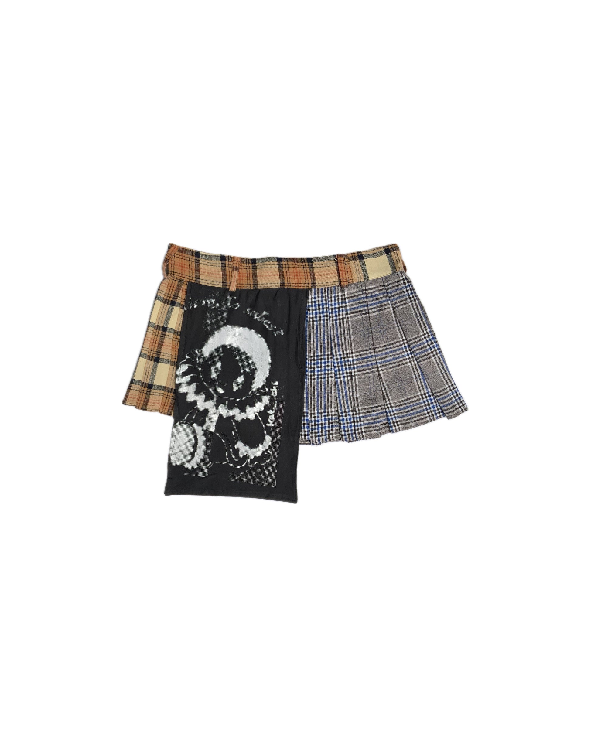 Falda corta escocesa gris y café con un estampado de payasito blanco en fondo negro, luce alternativa y hermosa. 🖤🦢🤡