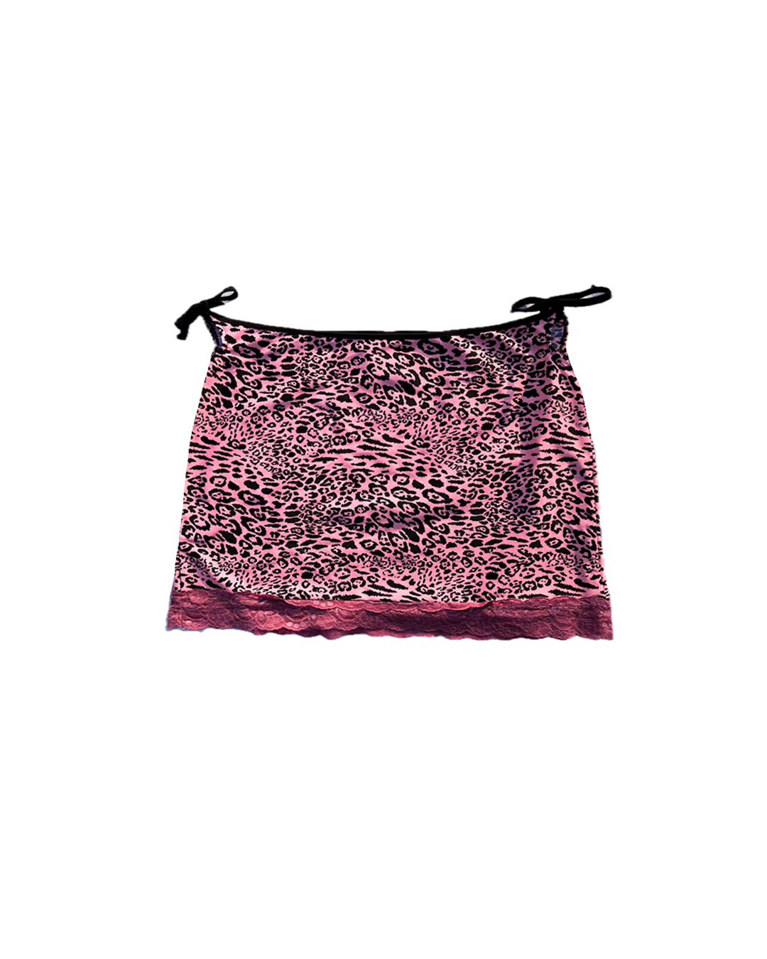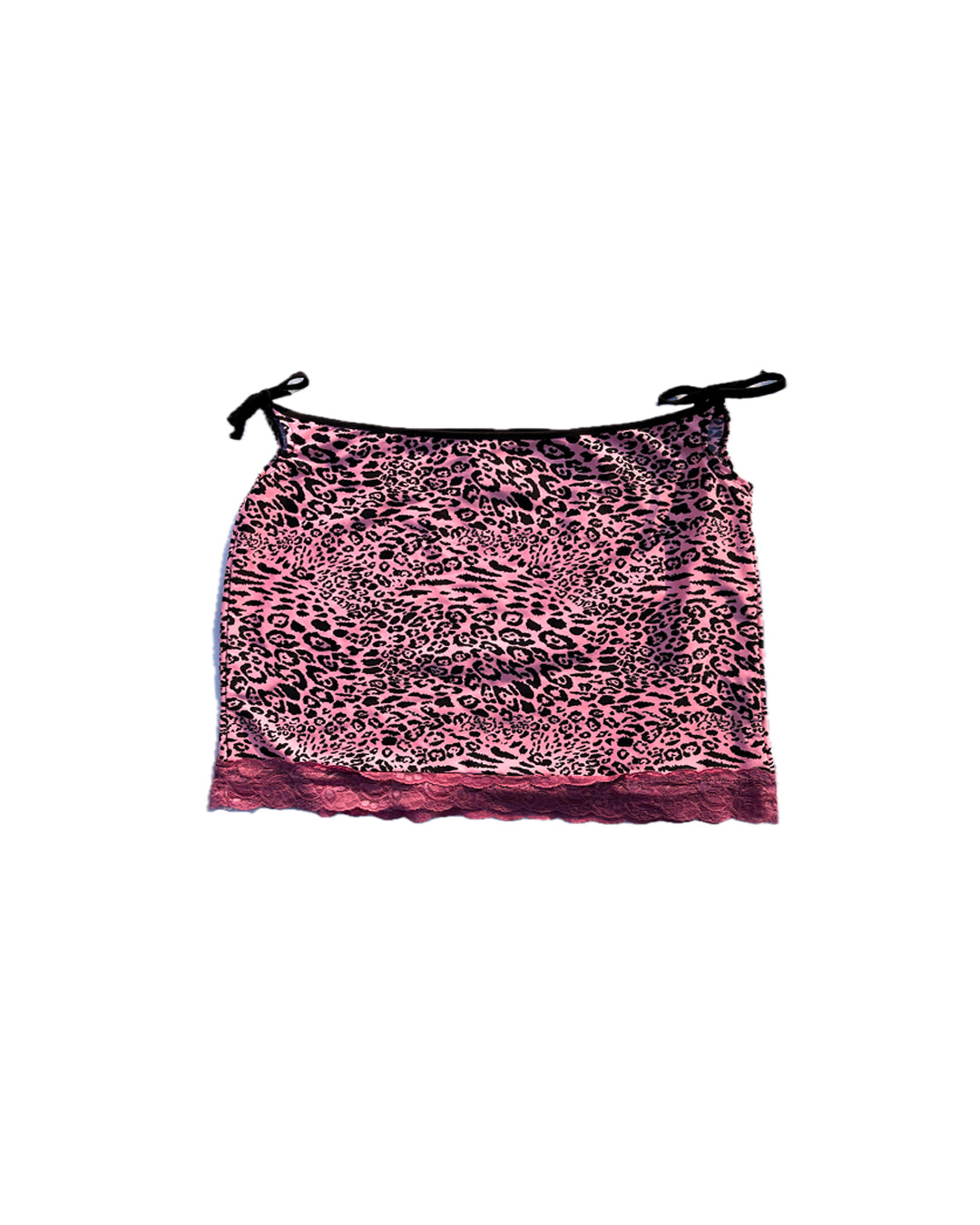 Falda Animal Print rosa de leopardo con tirantes negros y encaje morado.