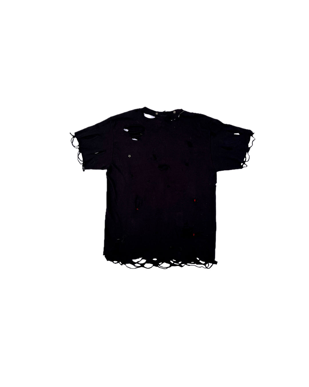 Playera negra con estampando de la Virgen en corte recto, intervenido a mano con trash, estoperoles y un margen rojo en el estampado, con vibras punks.
