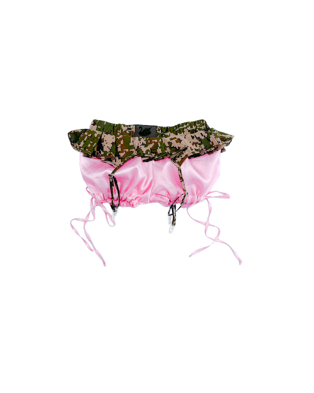 Parte de nuestra nueva línea, short globo de satin rosa con minifalda camu verde.