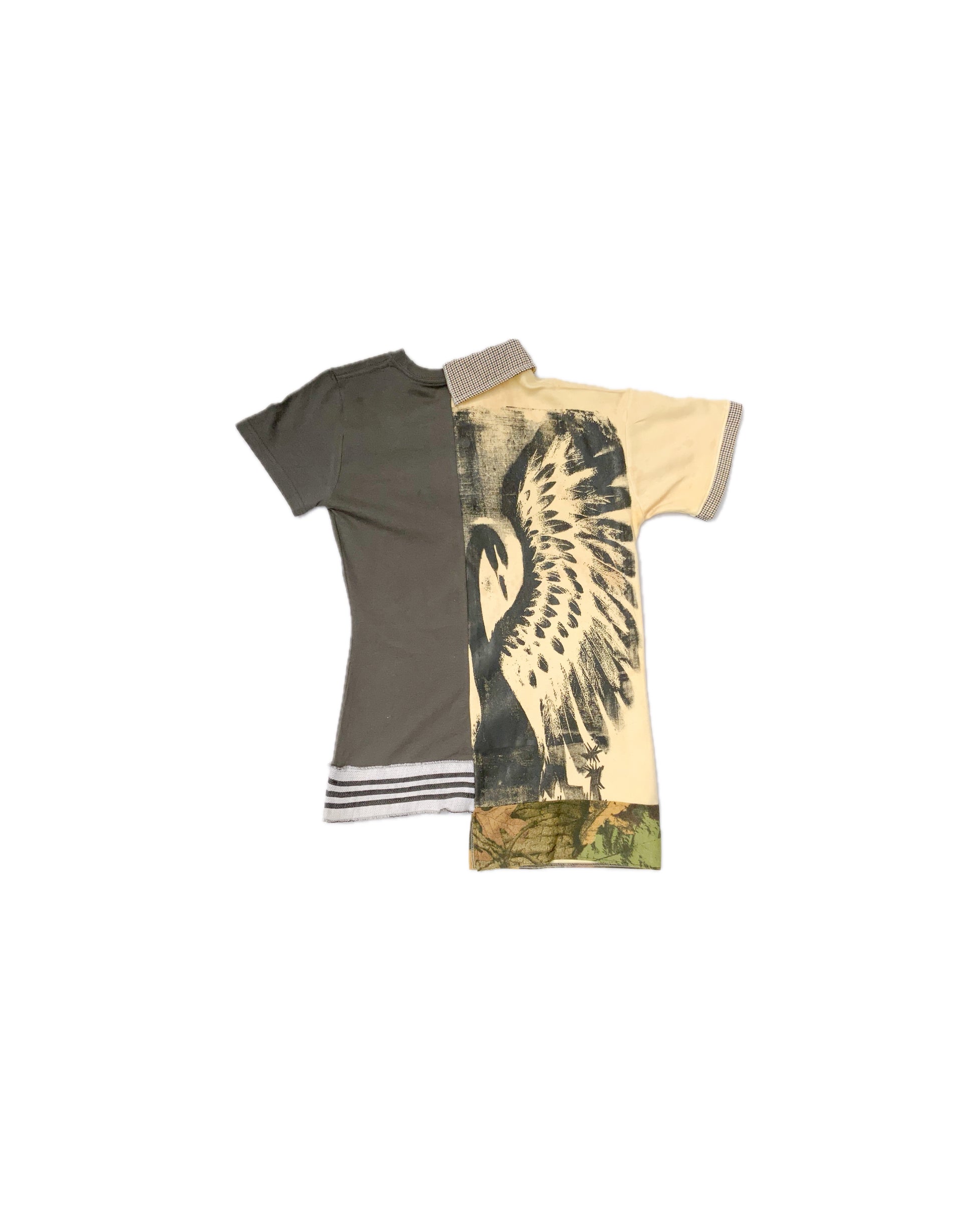 Playera upciclyn con diferentes intervenciones parte amarilla con estampado de cisne en la espalda y parte gris estampado de muñeca kat._.Chi, siguiendo una estética escolar. Dale una segunda oportunidad a la ropa con piezas única y luce hermosx. 🖤🦢✨